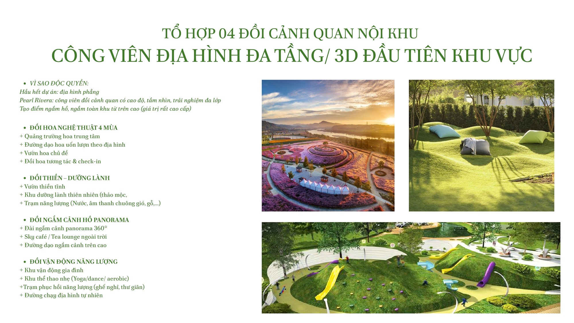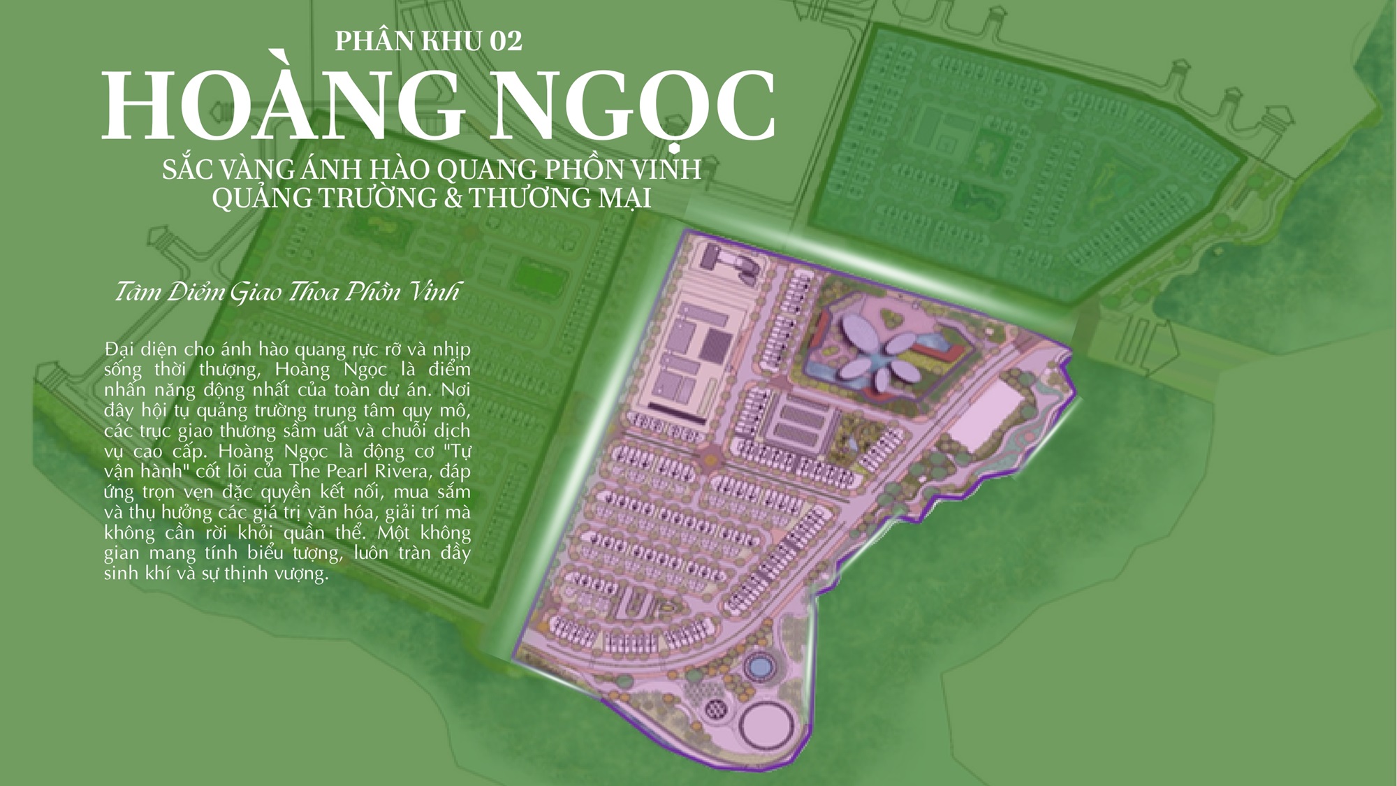 Khởi sinh bên Hồ Vân Trì nơi tầng khí thanh khiết giao hòa cùng mặt nước nguyên bản, Pearl Rivera Ha Noi được kiến tạo như một “Hồ Ngọc giữa tầng mây”, nuôi dưỡng một miền sống xanh sâu, tĩnh tại và đầy nội lực sinh thái. Lấy Self-contained City làm kim chỉ nam, toàn bộ đô thị vận hành trong một hệ sinh thái tự chủ – tự cân bằng – tự hưởng thụ, nơi an cư, kết nối, tận hưởng và tái tạo năng lượng hội tụ trong một vòng tròn sống liền mạch. Dẫn lối bởi triết lý Master Green Living, chất sống tại Miền Sống Mê Say lan tỏa từ thiên nhiên nguyên bản, mặt nước sinh thái và không gian ven hồ khoáng đạt, tạo nên nhịp sống vừa năng động theo dòng phát triển đô thị phía Bắc, vừa thư thái như nghỉ dưỡng bên Hồ Ngọc Vân Trì.
